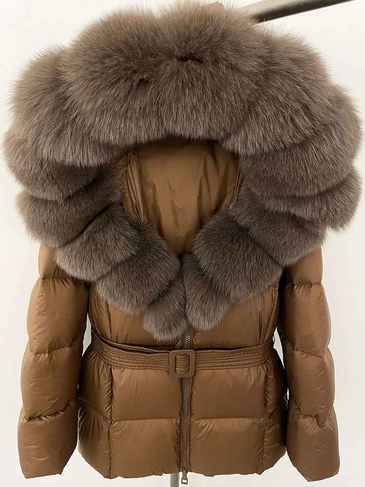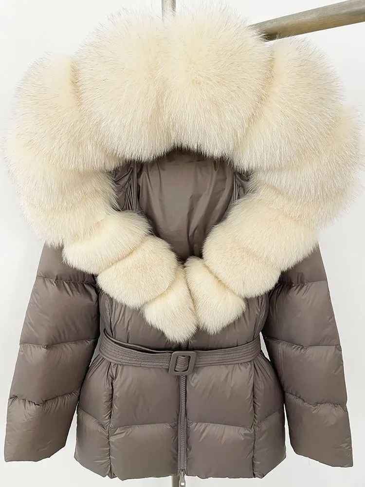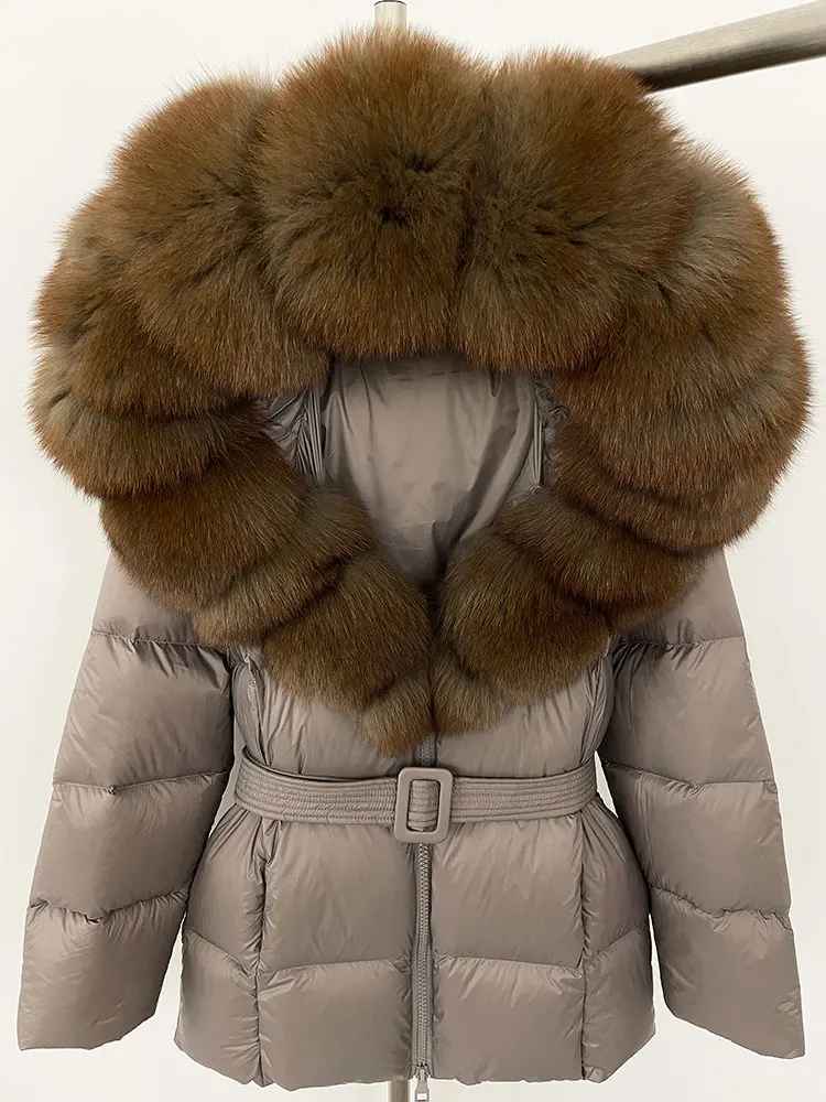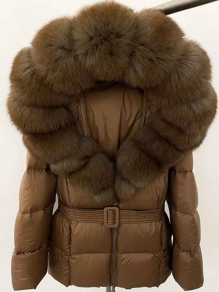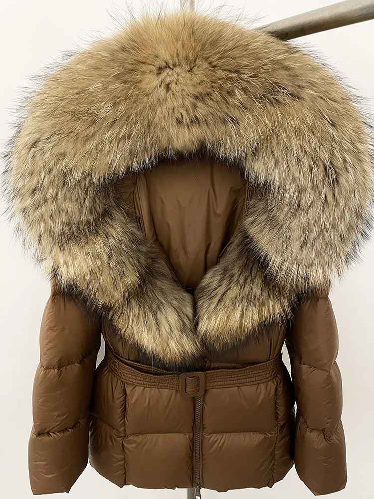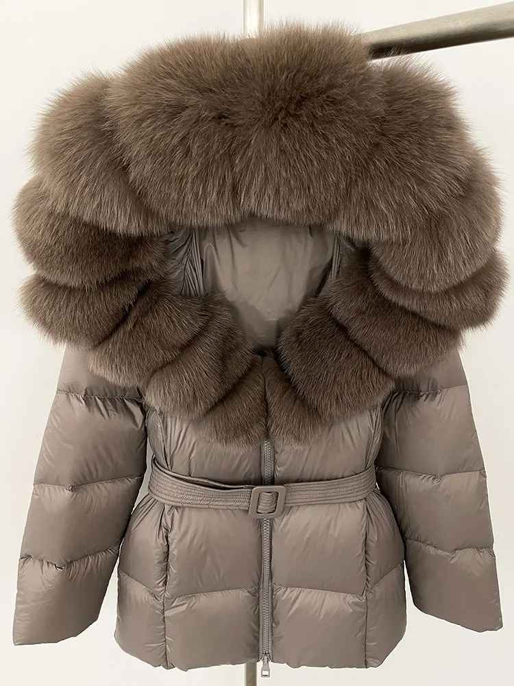 Varm dunjacka i kortare modell. Äkta pälskrage. Bälte i midjan för en figurskydd form.