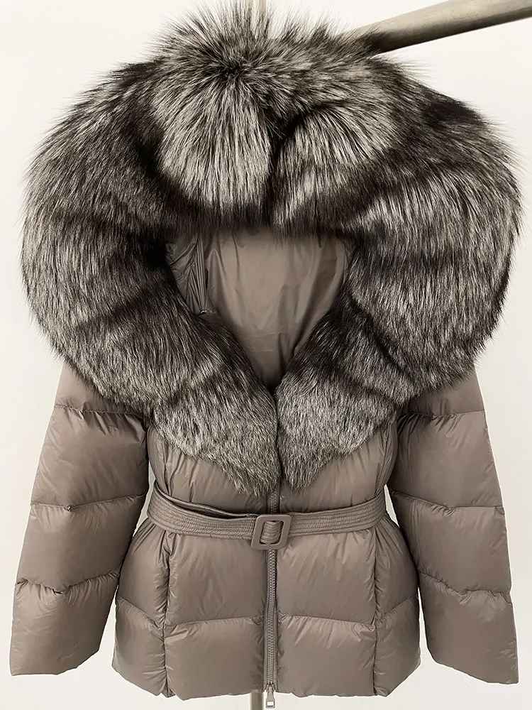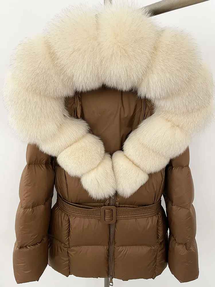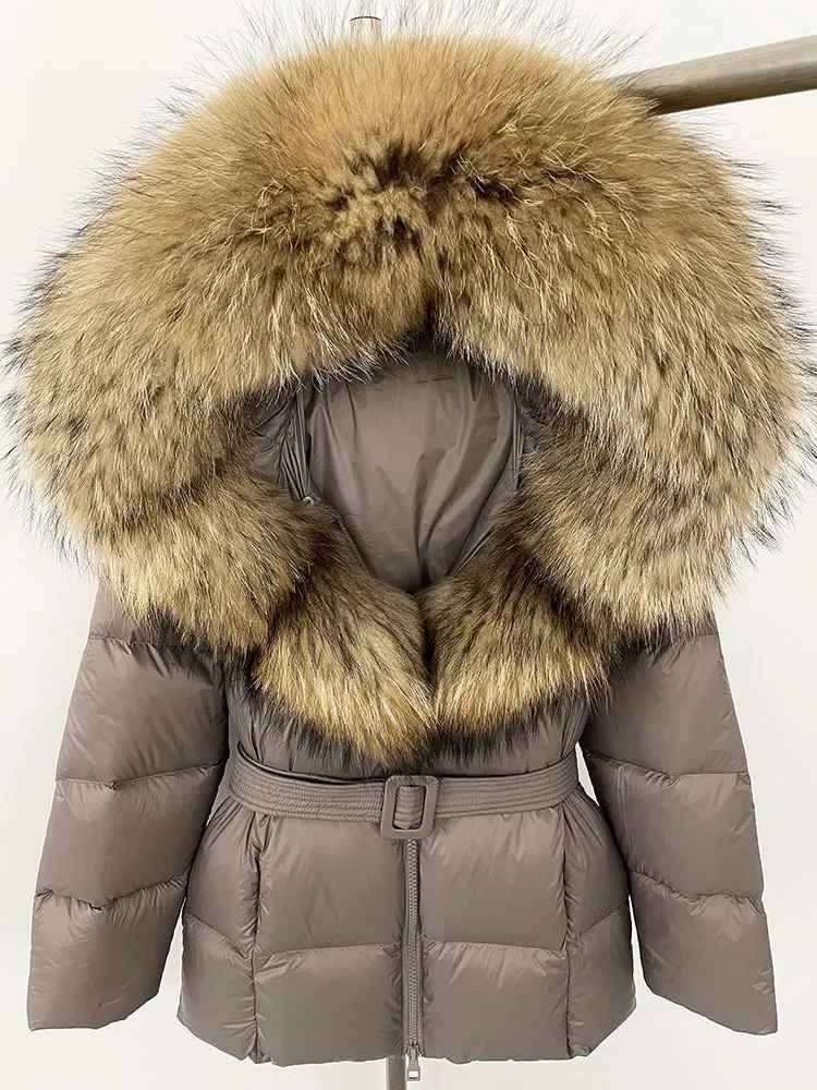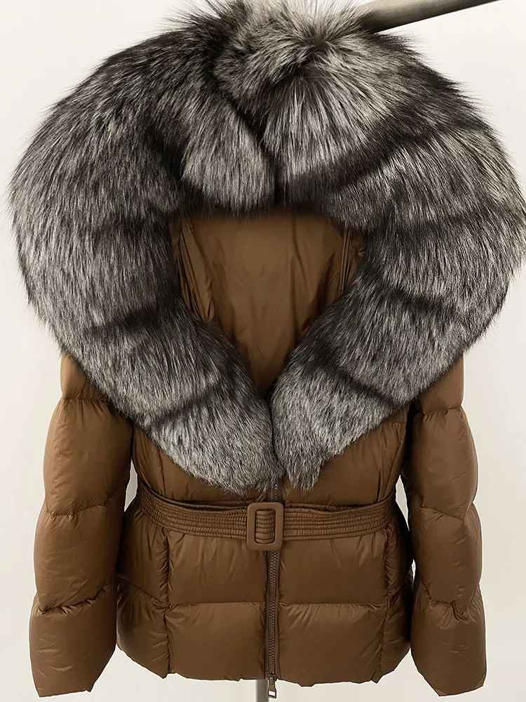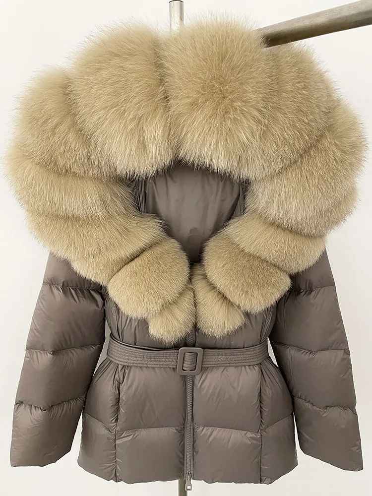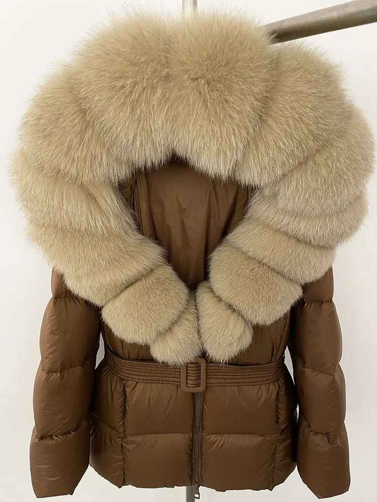 Varm dunjacka i kortare modell. Äkta pälskrage. Bälte i midjan för en figurskydd form.