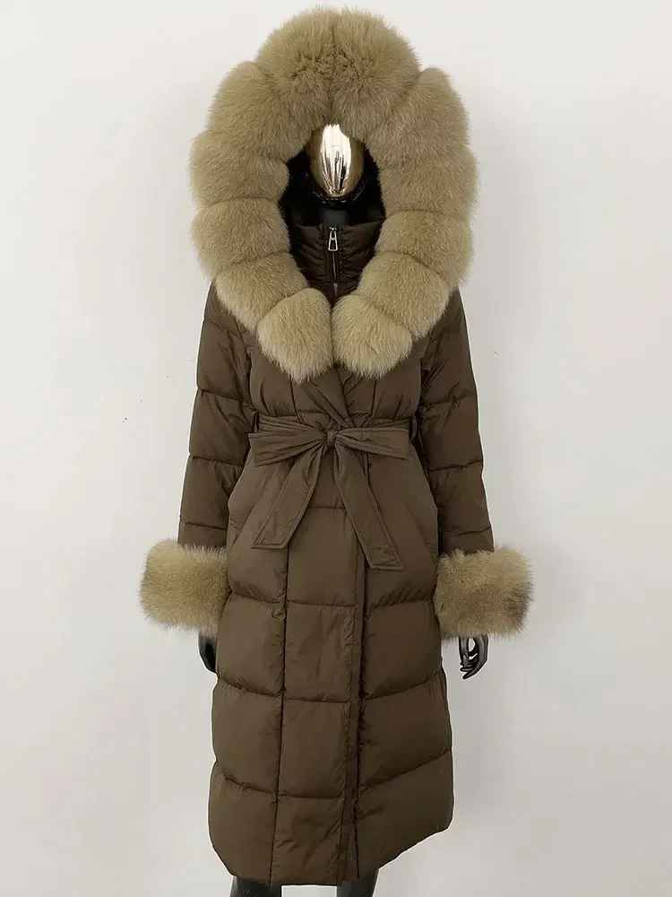 Varm dunjacka i längre modell. Äkta pälskrage. Bälte i midjan för en figurskydd form. Alla pälsdetaljer är borttagbara.